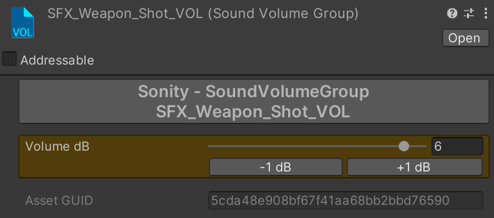 SoundVolumeGroup objects are used for grouped live volume control of multiple SoundEvents. You can assign them in the SoundEvent settings. It is perfect for quickly mixing the volume of a large group of sounds. It also supports +12dB volume if you βEnable Volume Increaseβ in the SoundManager. The volume is not meant to be changed at runtime in builds. If you want to control the volume in builds, take a look at the TemplateSoundVolumeManager script. All SoundVolumeGroup objects are multi-object editable. Example use: Add the same SoundVolumeGroup to all e.g. gunshot SoundEvents so you quickly can change their volumes.